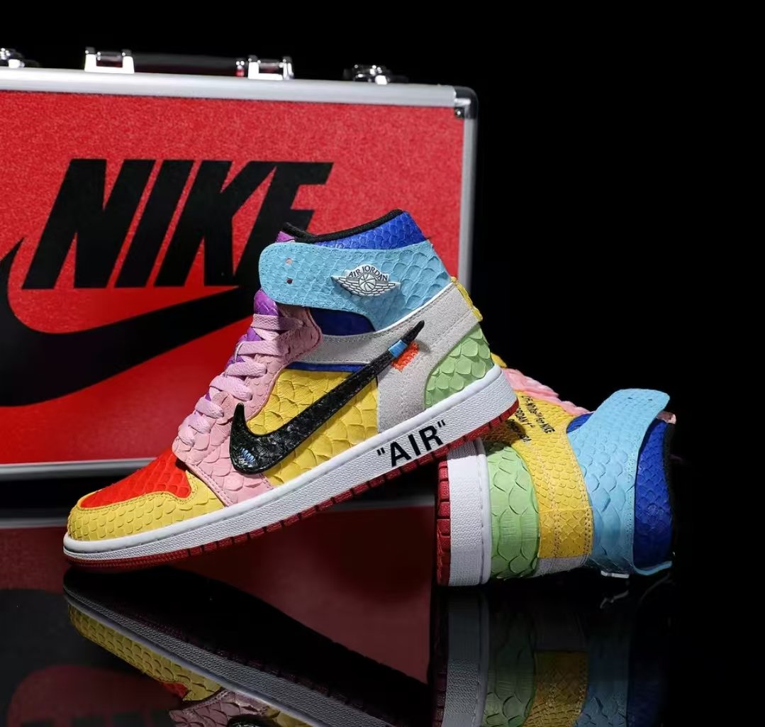 Pieza única que combina el ADN de Jordan y Off-White con un acabado multicolor y tridimensional, perfecta para coleccionistas y amantes de sneakers exclusivos.