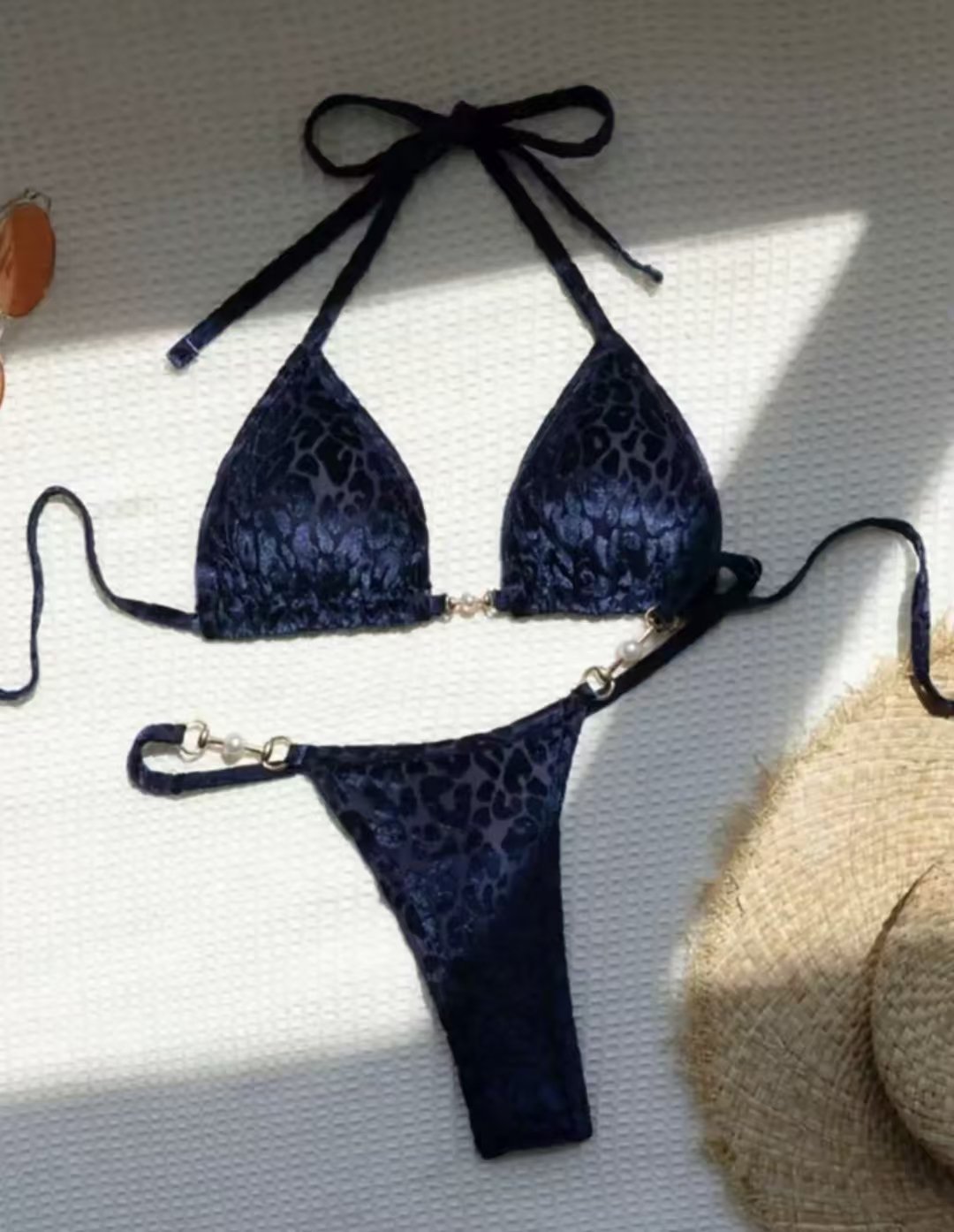 Un bikini que combina estilo clasico con detalles sofisticados. Las delicadas perlitas y los eslabones dorados aportan un toque de lujo discreto, mientras que el tejido brillante tipo leopardo aporta presencia y elegancia. Edicion limitada.