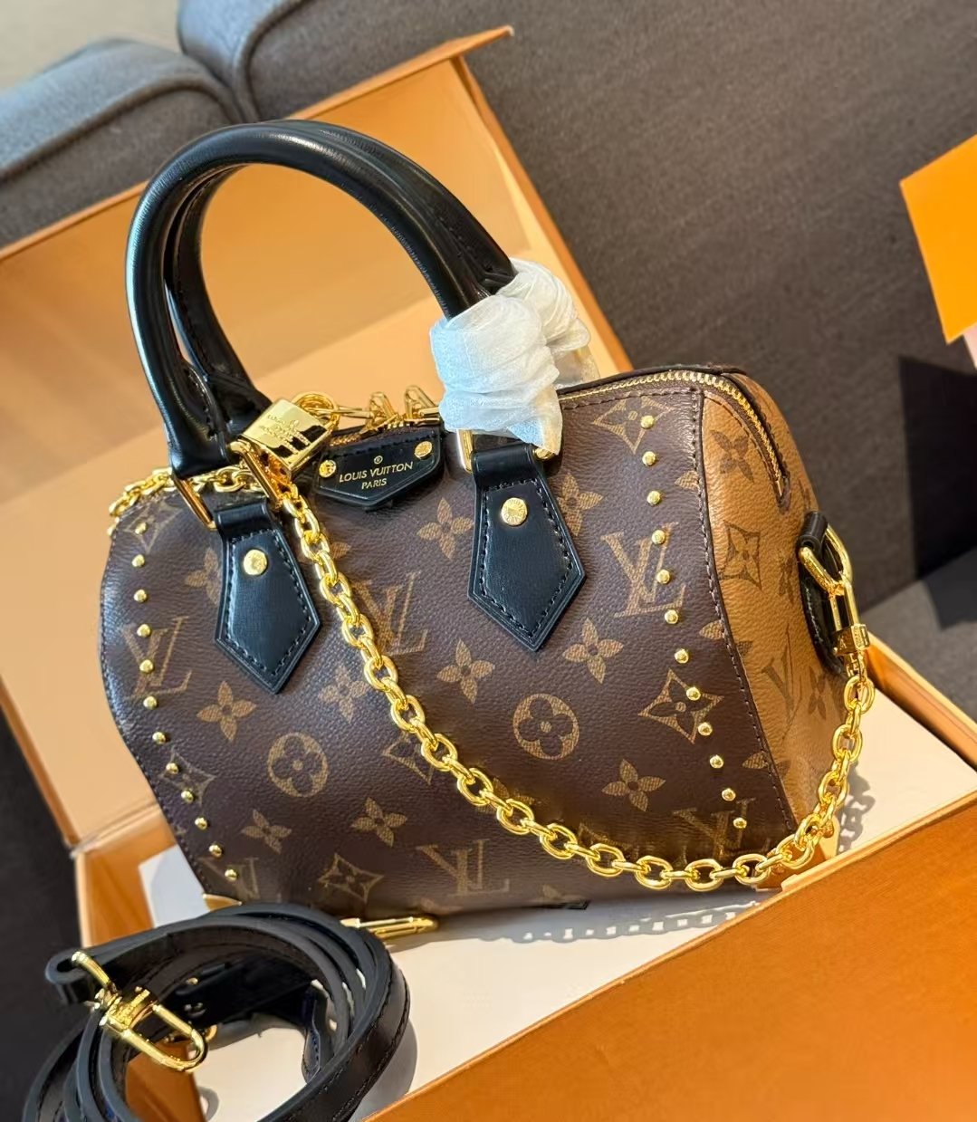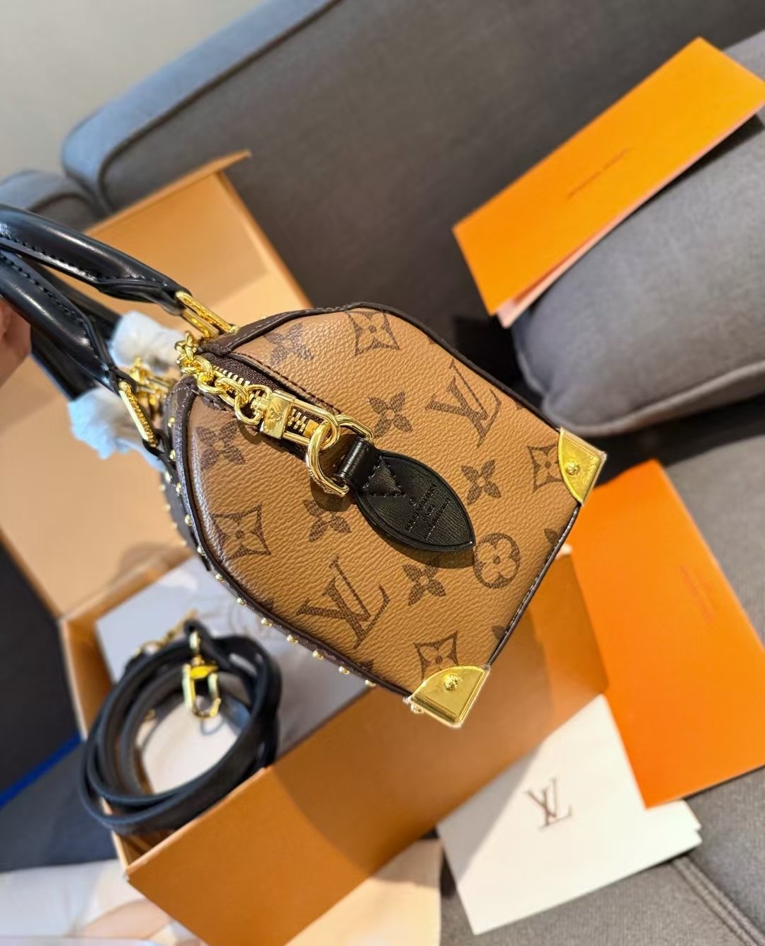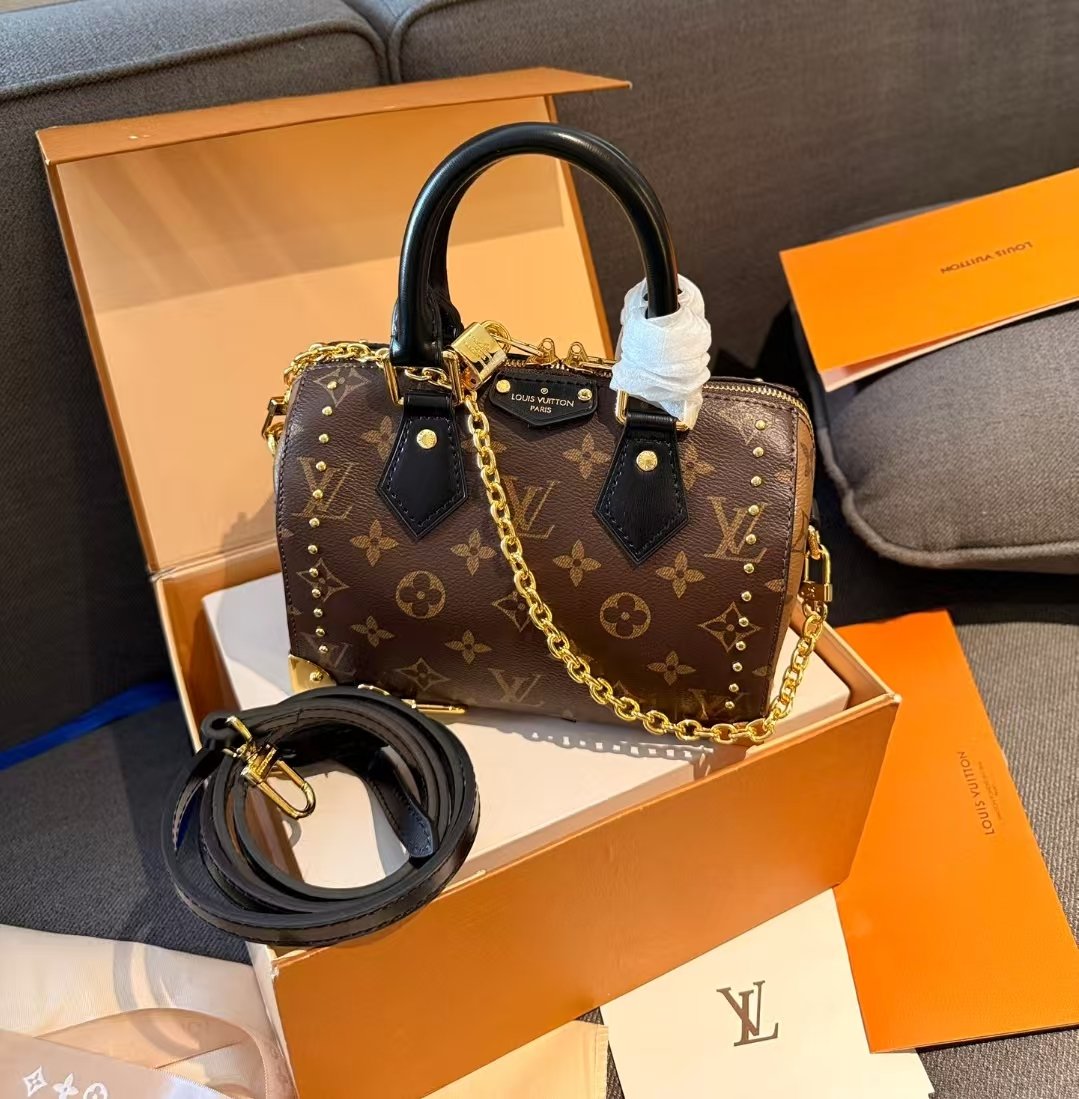 Luis Vuitton modelo speedy trunk 20. Este modelo tiene sofisticación natural con una silueta inconfundible con su forma cilíndrica. Asas de cuero enrolladas y candado grabado.