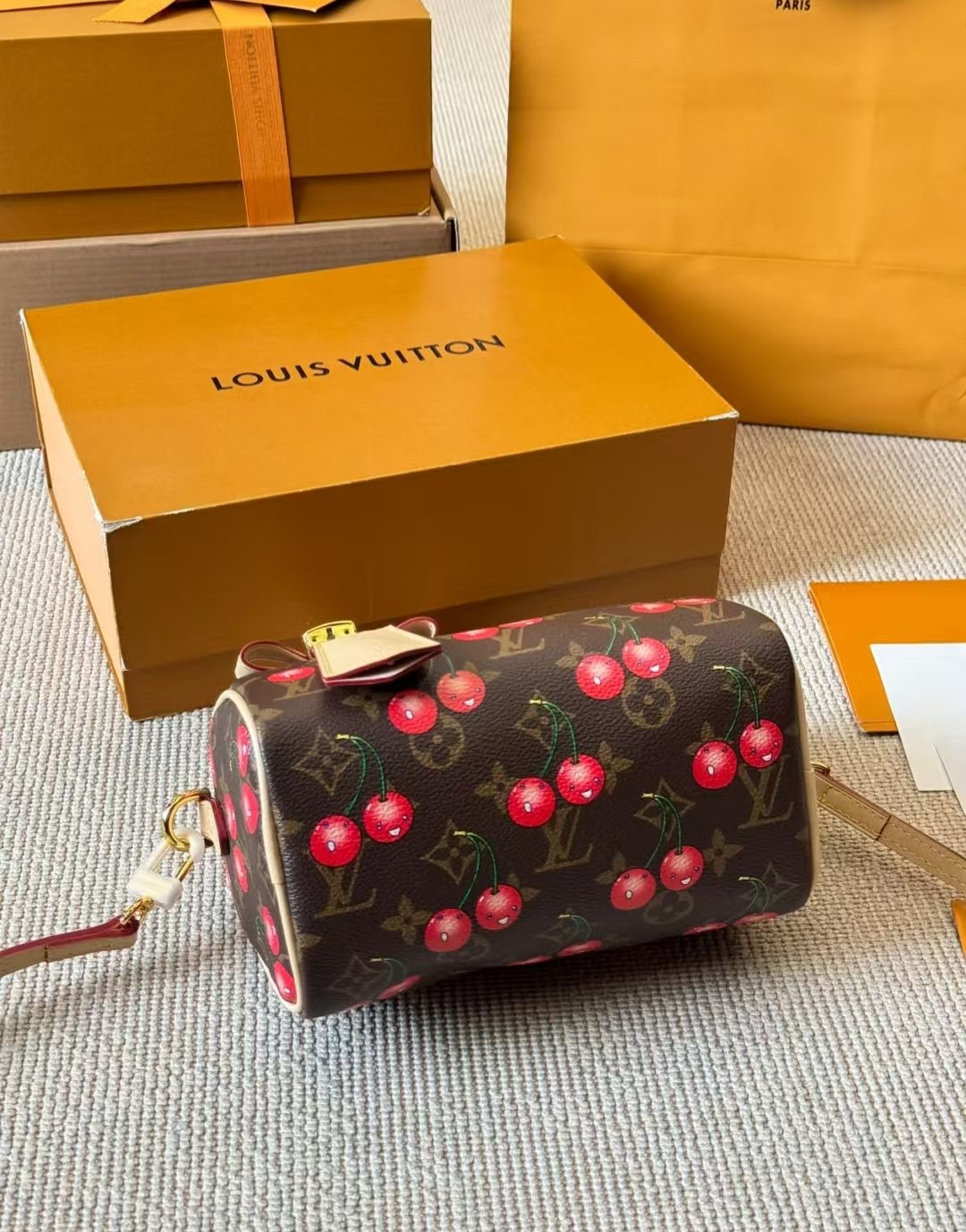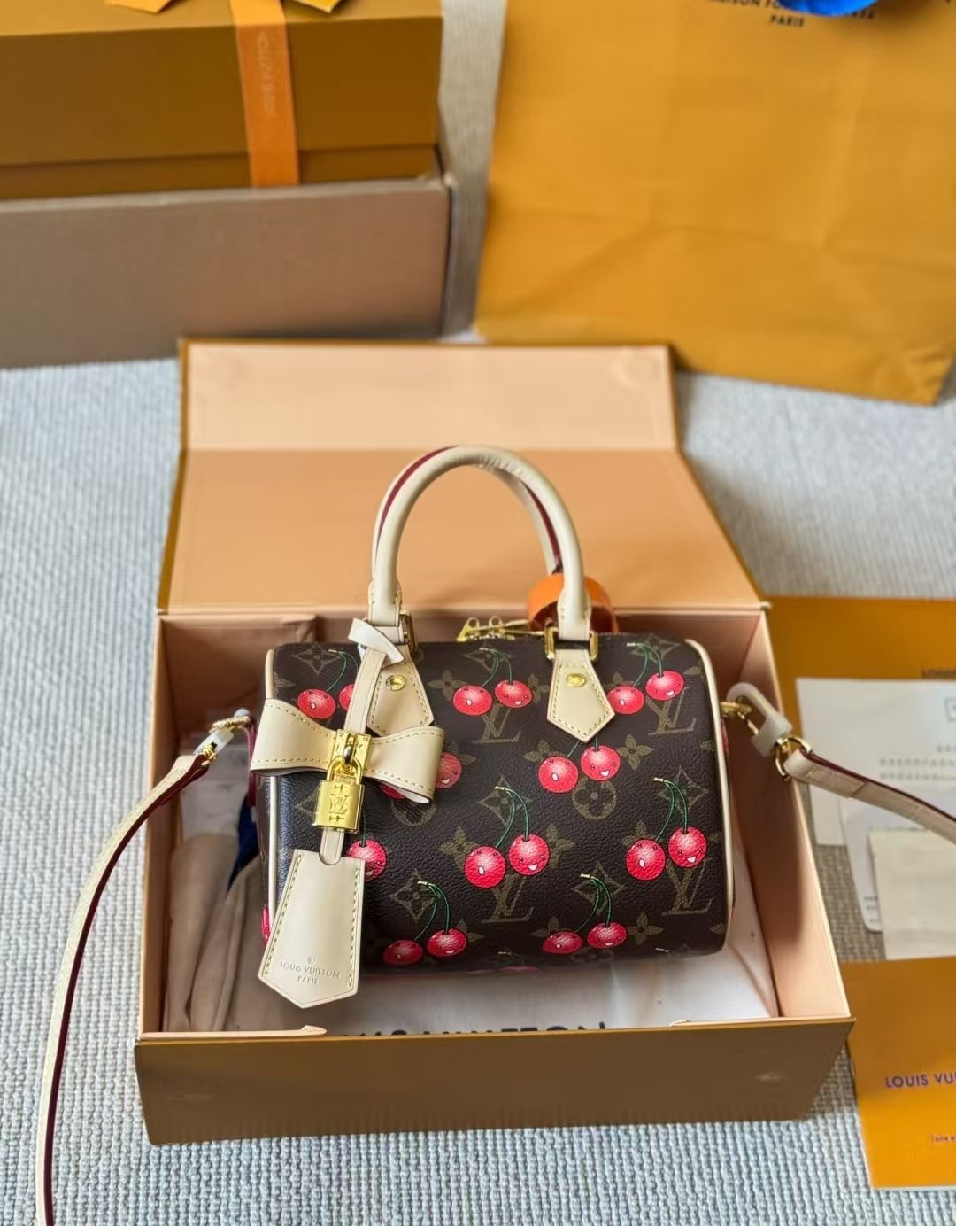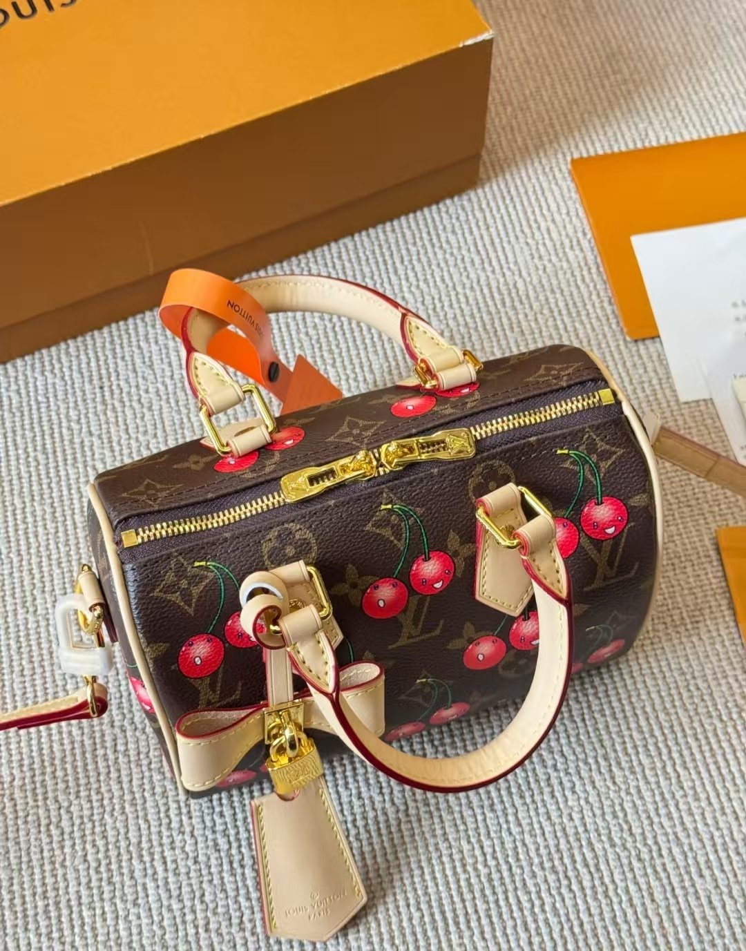 Louis Vuitton x Takashi Murakami Re Edition confeccionado con la icónica lona revertida con monograma de cereza. El asa superior de toron, la correa extraíble y el exclusivo llavero LVxTM.