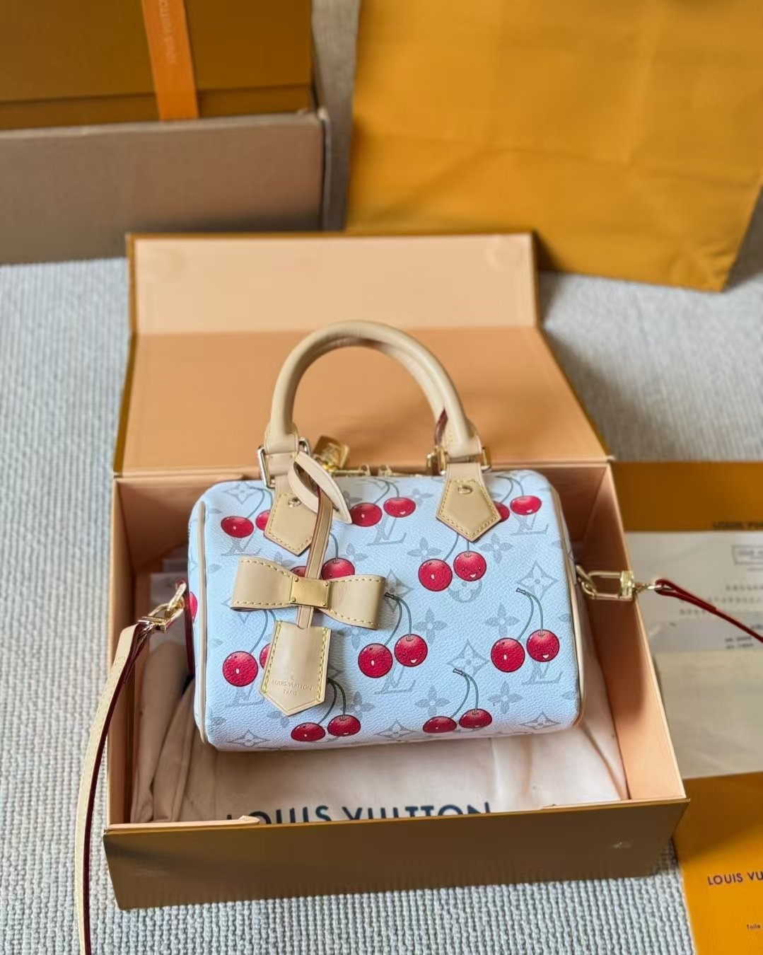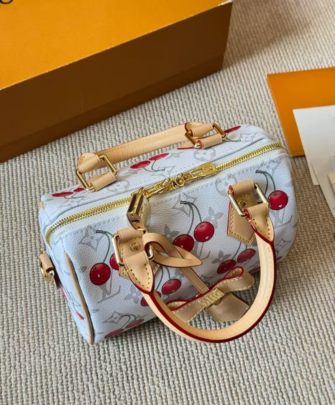 Louis Vuitton x Takashi Murakami Re edition confeccionado con la icónica lona revestida con monograma de cereza. El asa superior de toron, la correa extraíble y el exclusivo llavero LVxTM.