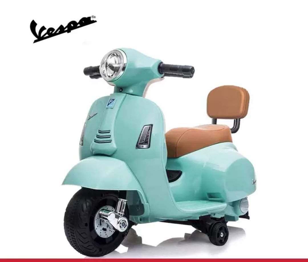 Moto eléctrica infantil con diseño clásico Vespa, ideal para los más pequeños. Funciona a batería recargable, es fácil de manejar y perfecta para jugar con total seguridad. Diversión asegurada con estilo retro. 🛵✨