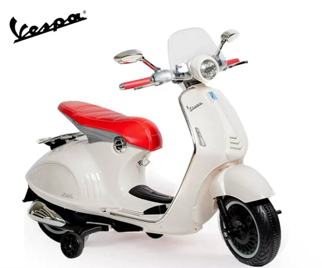 Moto eléctrica infantil con diseño clásico tipo Vespa, batería de 12 V y conducción suave y segura. Ideal para que los más pequeños disfruten de horas de diversión con estilo.